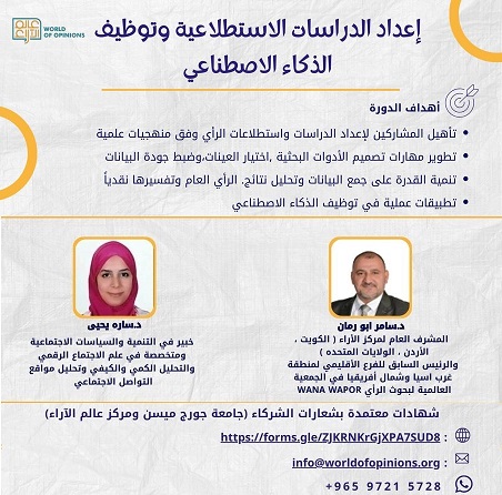 يعلن مركز عالم الآراء لاستطلاعات الرأي (WoO) عن بدء التسجيل في دورة تدريبية متخصصة بعنوان “إعداد الدراسات الميدانية والاستطلاعية وتوظيف الذكاء الاصطناعي”، تستهدف الباحثين والمهتمين بتطوير مهاراتهم في تصميم الدراسات وتحليل الرأي العام وفق منهجيات علمية حديثة.